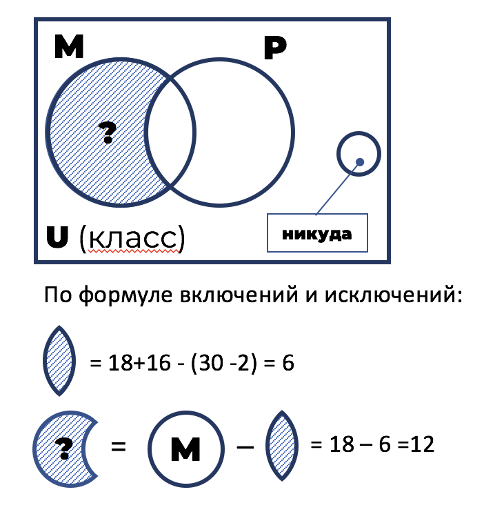 В классе 30 человек, из них 16 учеников посещают кружок по рисованию, 18 − кружок по математике, а двое не посещают ни один из этих кружков. Сколько человек посещают кружок по математике и не посещают кружок по рисованию?