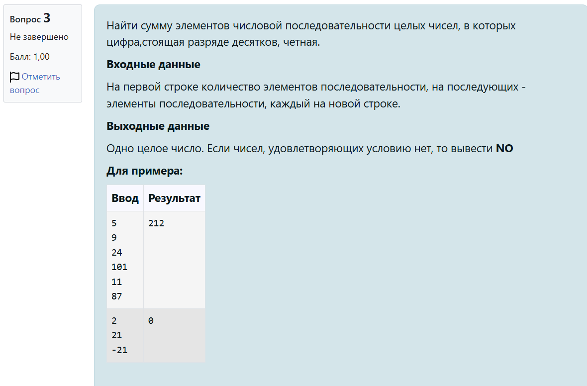 n = int(input()) #чтение кол-ва чисел в последовательности ans, ak = 0, 0 # инициализация ответа и число отобранных числе for _ in range(n): # цикл обработки x = int(input()) # чтение числа s = str(abs(x)) # проверка числа через строки - обязательное взятие МОДУЛЯ if len(s) > 1 and int(s[-2]) % 2 == 0 : # проверяем число знаков и разряд десятков ak +=1 #фиксируем увеличение числа отобранных ans += x #изменяем сумму if ak > 0 : #проверка для ответа и вывод print(ans) else : print('NO')