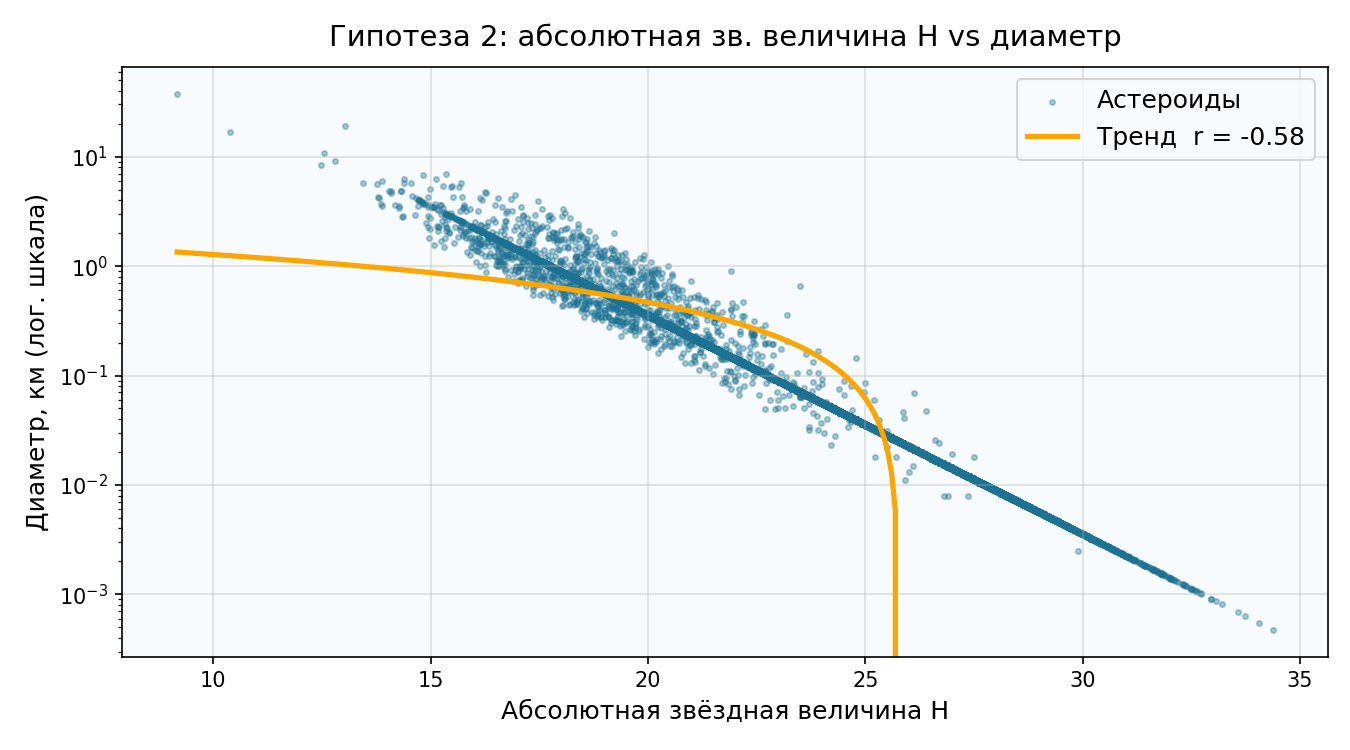 r = −0,58 — умеренная обратная связь, а не сильная (ожидалась −0,9+). Причина: диаметр зависит не только от H, но и от альбедо p, которое у разных астероидов варьируется в 10+ раз. Тёмный астероид и светлый одинакового размера дадут разные H. На графике с лог. шкалой виден чёткий нелинейный тренд по форме степенного закона.
