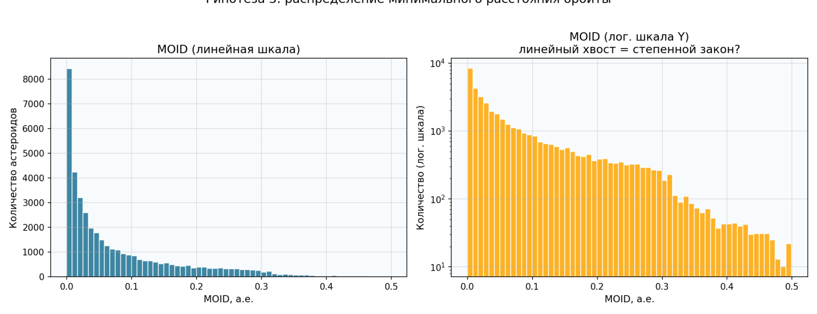 На логарифмической шкале хвост распределения близок к прямой линии — это признак степенного закона. Пик вблизи нуля объясняется «резонансными» орбитами, захваченными притяжением Земли — они удерживаются в определённом диапазоне MOID.
