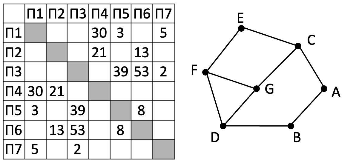 На рисунке справа схема дорог Н-ского района изображена в виде графа, в таблице содержатся сведения о длинах этих дорог (в километрах). Так как таблицу и схему рисовали независимо друг от друга, то нумерация населённых пунктов в таблице никак не связана с буквенными обозначениями на графе.