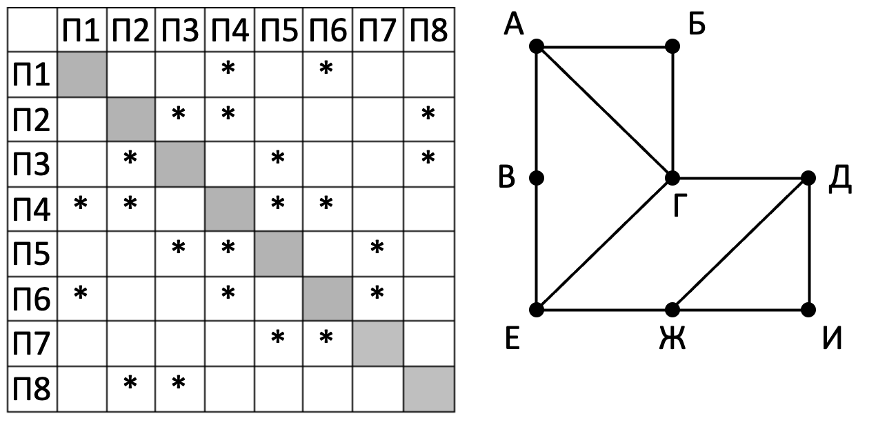 На рисунке справа схема дорог Н-ского района изображена в виде графа, звёздочка в ячейке таблицы обозначает наличие дороги между двумя пунктами. Так как таблицу и схему рисовали независимо друг от друга, то нумерация населённых пунктов в таблице никак не связана с буквенными обозначениями на графе.