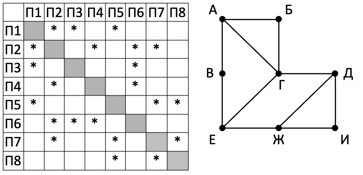 На рисунке справа схема дорог Н-ского района изображена в виде графа, звёздочка в ячейке таблицы обозначает наличие дороги между двумя пунктами. Так как таблицу и схему рисовали независимо друг от друга, то нумерация населённых пунктов в таблице никак не связана с буквенными обозначениями на графе.