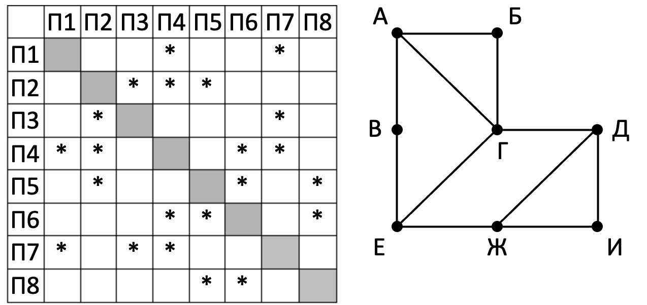 На рисунке справа схема дорог Н-ского района изображена в виде графа, звёздочка в ячейке таблицы обозначает наличие дороги между двумя пунктами. Так как таблицу и схему рисовали независимо друг от друга, то нумерация населённых пунктов в таблице никак не связана с буквенными обозначениями на графе.