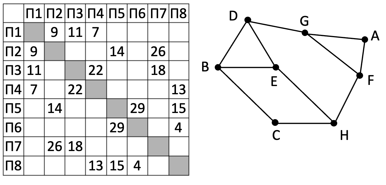 На рисунке справа схема дорог Н-ского района изображена в виде графа, в таблице содержатся сведения о длинах этих дорог (в километрах). Так как таблицу и схему рисовали независимо друг от друга, то нумерация населённых пунктов в таблице никак не связана с буквенными обозначениями на графе.