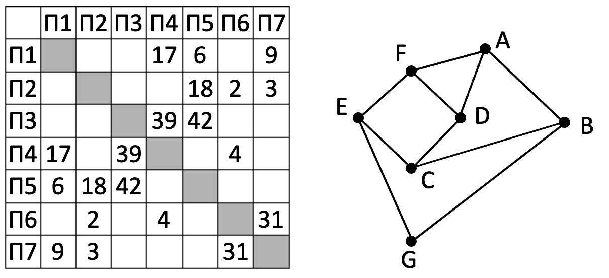 На рисунке справа схема дорог Н-ского района изображена в виде графа, в таблице содержатся сведения о длинах этих дорог (в километрах). Так как таблицу и схему рисовали независимо друг от друга, то нумерация населённых пунктов в таблице никак не связана с буквенными обозначениями на графе.
