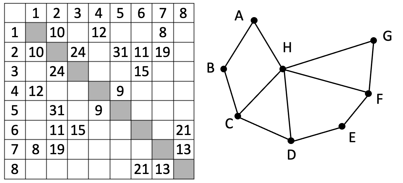 На рисунке справа схема дорог Н-ского района изображена в виде графа, в таблице содержатся сведения о длинах этих дорог (в километрах). Так как таблицу и схему рисовали независимо друг от друга, то нумерация населённых пунктов в таблице никак не связана с буквенными обозначениями на графе.
