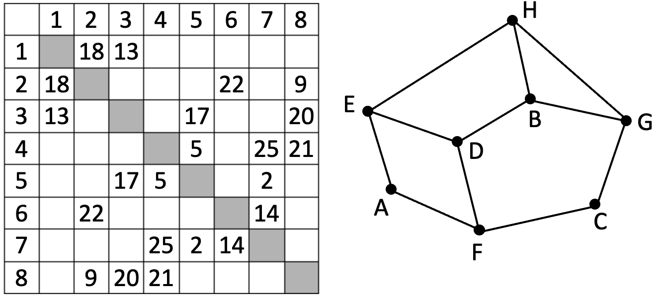 На рисунке справа схема дорог Н-ского района изображена в виде графа, в таблице содержатся сведения о длинах этих дорог (в километрах). Так как таблицу и схему рисовали независимо друг от друга, то нумерация населённых пунктов в таблице никак не связана с буквенными обозначениями на графе.