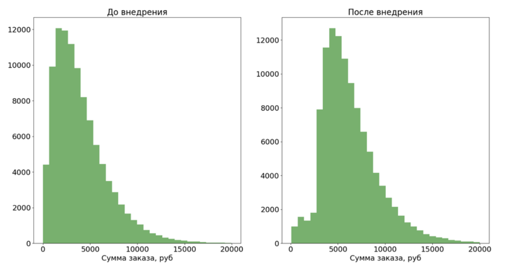 В сервисе по доставке продуктов внедрили рекомендательную систему, которая на моменте совершения оплаты предлагает доложить в корзину дополнительные релевантные товары. Перед вами распределение суммы заказа до внедрения рекомендательной системы и после