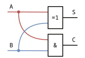 Полусумматор – это логическая схема, которая принимает на вход два логических значения и и выдаёт на выходе два логических значения и (сумму и с учётом переноса). Ниже представлена таблица истинности для такой схемы и пример её реализации с использованием исключающего ИЛИ и И: