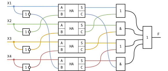 Оставшись после занятия, Витя решил собрать свою схему с использованием нескольких полусумматоров: