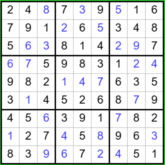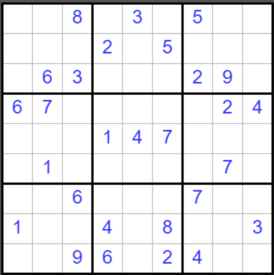 Задача - вписать в пустые ячейки головоломки числа от 1 до 9 так, чтобы в каждом горизонтальном ряду, в каждой вертикальной колонке и в каждом блоке каждое число встречалось только однажды.