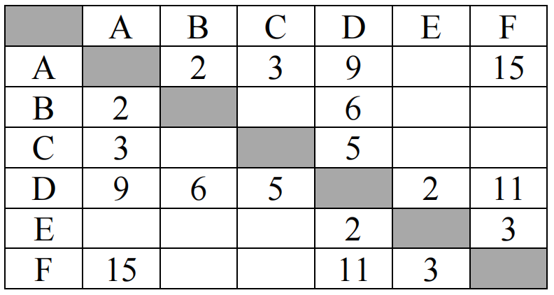 Между населёнными пунктами A, B, C, D, E, F построены дороги, протяжённость которых (в километрах) приведена в таблице.