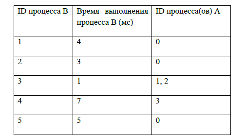 В файле 22-46.xls содержится информация о совокупности N вычислительных процессов, которые могут выполняться параллельно или последовательно. Будем говорить, что процесс B зависит от процесса A, если для выполнения процесса B необходимы результаты выполнения процесса A. В этом случае процессы могут выполняться только последовательно. Информация о процессах представлена в файле в виде таблицы. В первом столбце таблицы указан идентификатор процесса (ID), во втором столбце таблицы – время его выполнения в миллисекундах, в третьем столбце перечислены с разделителем «;» ID процессов, от которых зависит данный процесс. Если процесс является независимым, то в таблице указано значение 0.