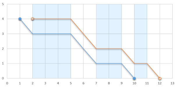 На некоторых отрезках действуют восходящие потоки воздуха, характеризующиеся двумя числами \(x_1\) и \(x_2\) (\(x_1 < x_2\)). Они действуют по всей высоте. Никакие два потока не пересекаются и не имеют общих точек. Если планерист попадает в восходящий поток, то он не теряет высоту, пока летит в этом потоке. Изменение по оси \(Ox\) остается таким же — он двигается на единицу вправо за одну секунду.
