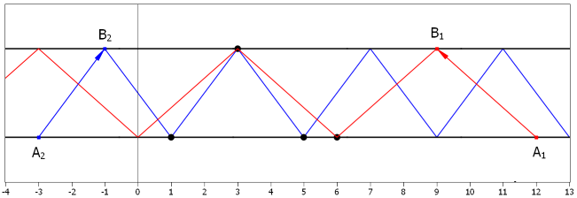Вы собираетесь провести эксперимент с этой трубой и лазерным лучом. Для этого надо выбрать две целочисленные точки \(A\) и \(B\) на первой и второй прямой соответственно (координаты точек могут быть отрицательные): точка \(A\) будет отвечать за позицию лазера, а точка \(B\) — за направление лазерного луча. Лазерный луч представляет собой луч, стартующий в \(A\) и направленный в \(B\), который отражается от стенок трубы (независимо от того, есть в данной точке сенсор или нет). Сенсор регистрирует луч, если он попадает точно в позицию сенсора.