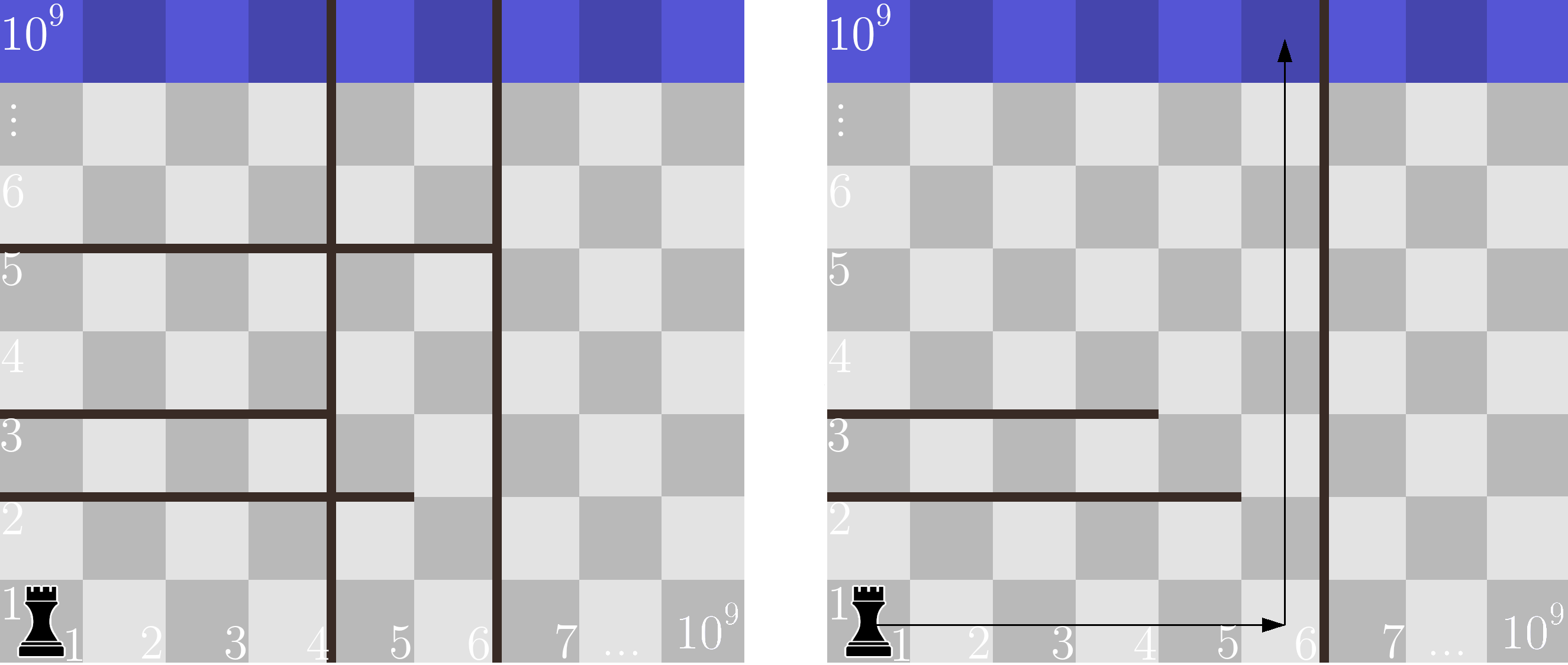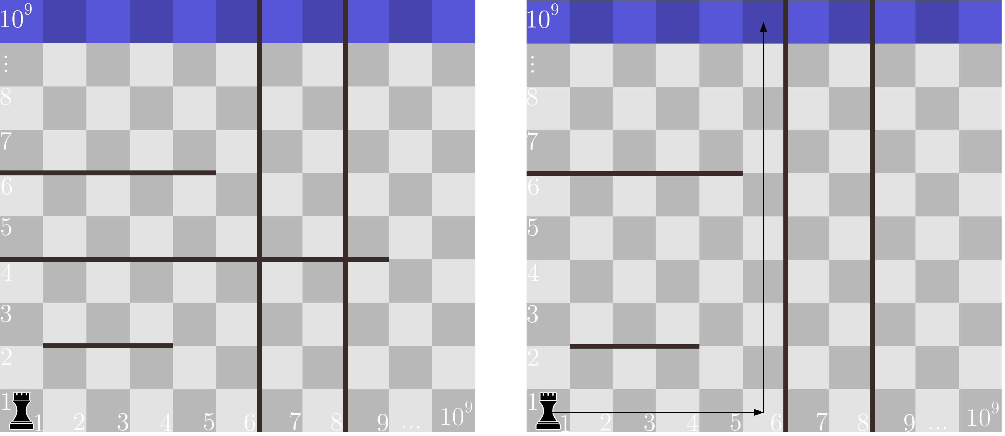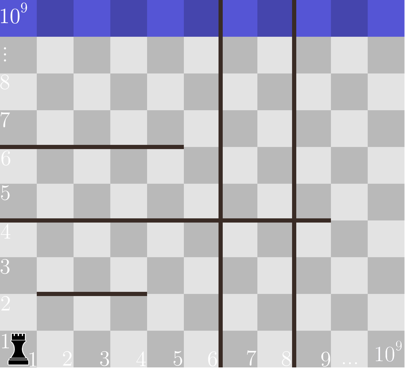 На этой доске каждый день проходят бои между чёрными и белыми фигурами. Сегодня победу одержали чёрные, но какой ценой? В живых осталась лишь ладья, и то, загнанная в левый нижний угол — клетку с координатами \((1,1)\). Но она все равно счастлива, ведь победа одержана и надо её отпраздновать! Для того чтобы это сделать, ладье нужно вернуться домой, а именно — на верхнюю сторону поля (то есть в любую клетку, которая находится в строке под номером \(10^9\)).