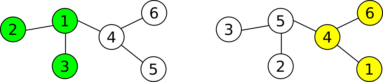 В таком случае, вы знаете что есть только одно поддерево с размером \(3\), которое не содержит вершину \(1\), — это \(4,5,6\). Вы спрашиваете Андрея номер вершины \(1\) в нумерации Ли Чена. Он отвечает \(5\). В таком случае, вы знаете, что поддерево Ли Чена не содержит \(1\), значит его поддерево должно содержать \(4,5,6\) (в его нумерации), по этому два поддерева не имеют общих вершин.