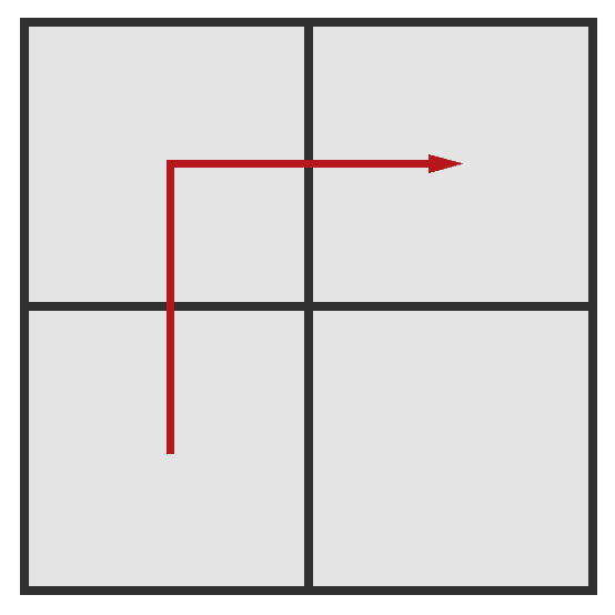 Оля применяет первую операцию к единственному существующему квадрату. Вторую операцию она применяет к правому нижнему квадратику. Тогда условие счастья Оли будет соблюдено, так как существует путь из квадратиков одинакового размера от левого нижнего квадратика до правого верхнего: