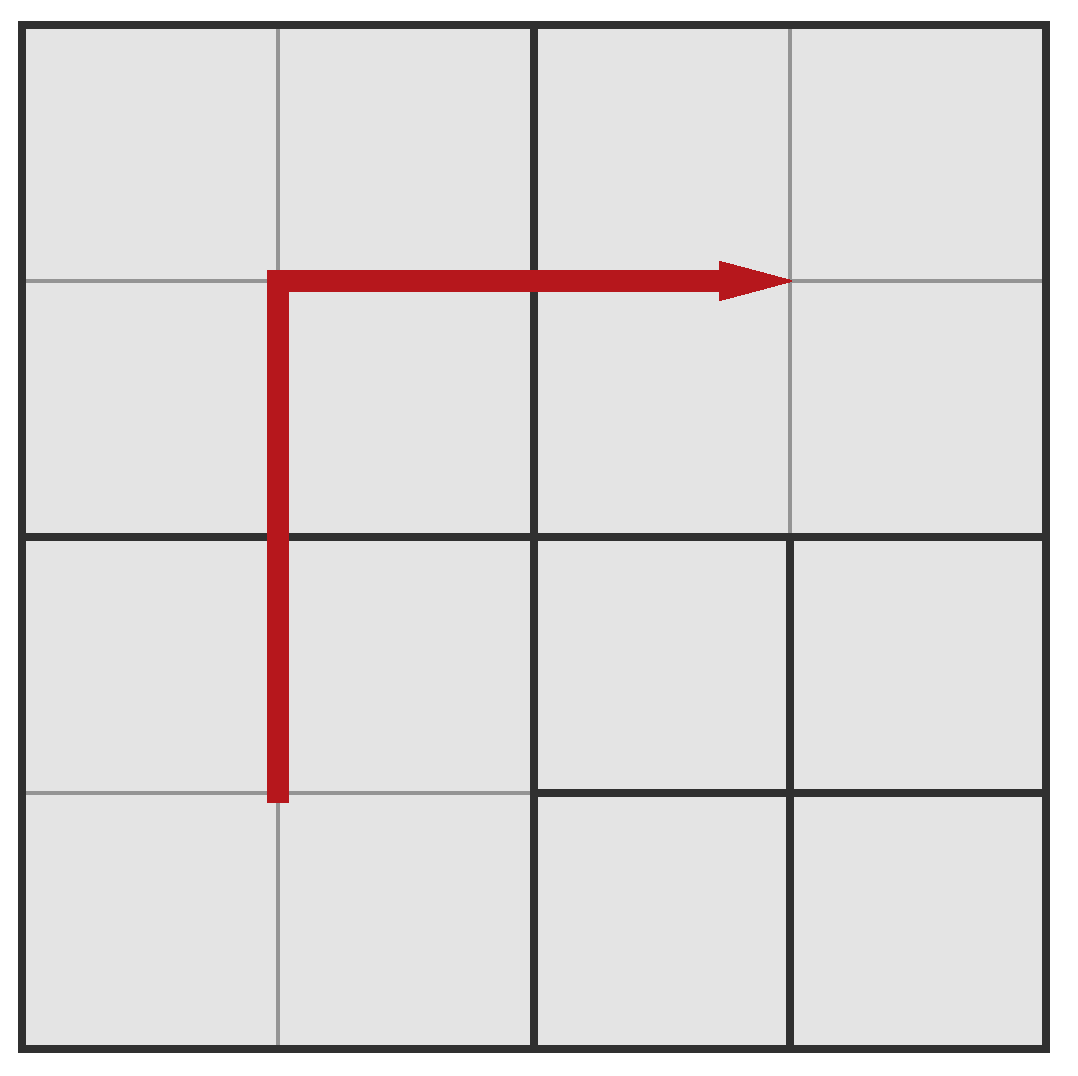 Пускай длина стороны левого нижнего квадратика равна \(a\), то и длина стороны правого верхнего квадратика тоже должна равняться \(a\). Также должен существовать путь между ними, который состоит только из квадратиков с длиной стороны \(a\). Все последовательные квадраты на пути должны иметь общую сторону.