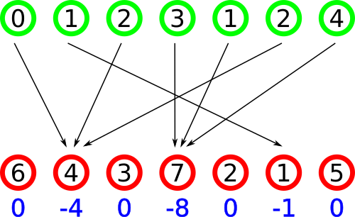 Пример шага битвы. Числа в зеленых кружках показывают число солдат в группах армии Евлампия, стрелки показывают атаки, числа в красных кружках показывают запас здоровья групп противника, синие числа показывают, насколько после этого шага уменьшится запас здоровья каждой из групп. Евлампий понял, что предстоящее сражение отнимет у него всю ночь. Это очень его расстроило, ведь тогда он не успеет сделать домашнее задание. Теперь Евлампий просит вас написать программу, которая поможет ему победить в сражении за наименьшее число ходов и показать, как это сделать. Сможете ли вы ему помочь?