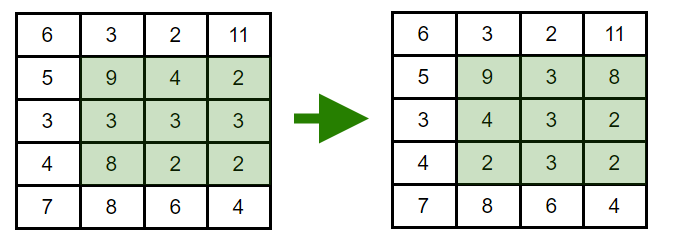 Квадратной подматрицей матрицы \(M\) называется матрица, образованная элементами на пересечении множества строк с номерами \(x, x+1, \dots, x+k-1\) матрицы \(M\) и множества столбцов с номерами \(y, y+1, \dots, y+k-1\) матрицы \(M\), где \(k\) — размер квадратной подматрицы. Иными словами, квадратная подматрица — это набор ячеек исходной матрицы, которые образуют сплошной (без пустот) квадрат со сторонами параллельными сторонам исходной матрицы.