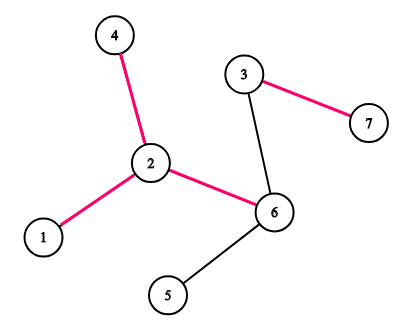 Рассмотрим дерево, изображенное на рисунке. Если \(k=3\), то следующие последовательности являются хорошими: \([1, 4, 7]\), \([5, 5, 3]\) и \([2, 3, 7]\). Следующие последовательности не являются хорошими: \([1, 4, 6]\), \([5, 5, 5]\), \([3, 7, 3]\).