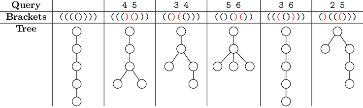 Сов выписал описание подвешенного дерева из \(n\) вершин. Затем, он изменил его описание \(q\) раз. Каждый раз, когда он выписывал новое описание, он выбирал два разных символа в описании, которое он написал в прошлый раз, менял их местами и записывал полученную строку. Он всегда следил за тем, чтобы каждая записанная строка была описанием подвешенного дерева.