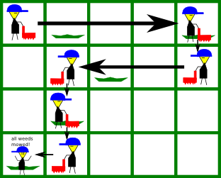 У вас есть газонокосилка, и вы хотите скосить все сорняки. Изначально вы и ваша газонокосилка находитесь в левом верхнем углу сада, то есть в клетке (1, 1). В каждый момент времени вы смотрите либо направо, либо налево. Изначально вы смотрите направо.