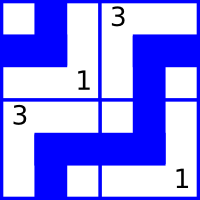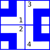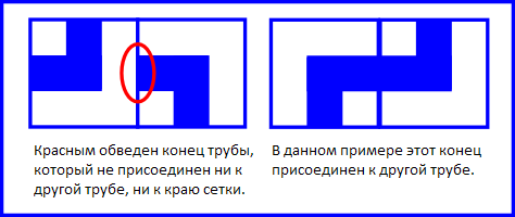 Маленький Джон считает, что система труб протекает, если хотя бы один конец одного фрагмента не подсоединен ни к другому концу, ни к краю поля. Ниже приведены примеры двух систем труб размера 1 × 2. Система труб в левом примере протекает, в правом — не протекает.