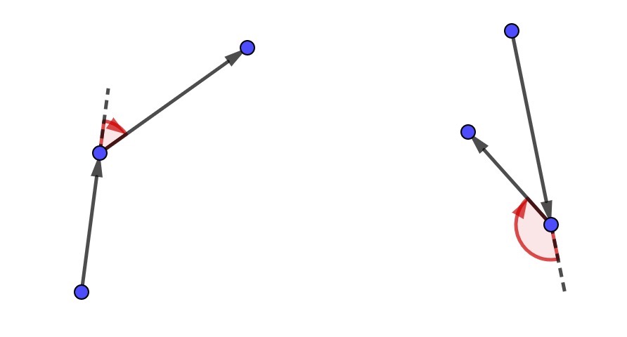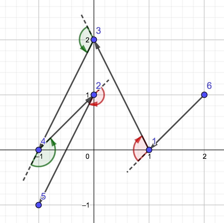 Сделав так, он нарисует ориентированную ломаную на этих вершинах, проведя направленные отрезки из каждой точки в следующую в выбранном порядке точку. То есть для всех \(1 \leq i \leq n-1\) он проведет направленный отрезок из точки \(A_{p_i}\) в точку \(A_{p_{i+1}}\). Он хочет, чтобы получившаяся ломаная удовлетворяла \(2\)-м условиям: