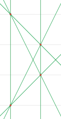 На входе на станцию висит карта, описывающая систему проводов электростанции. Селена лучше всего из друзей разбирается в математике. Он решил нарисовать карту на декартовой плоскости. Теперь каждый полюс это точка по координатам \((x_i, y_i)\). Так как все полюса различны, то различны и точки, представляющие их. Также каждые два полюса соединены друг с другом проводом, представляющим из себя бесконечную в обе стороны прямую на плоскости. В случае если более двух полюсов лежат на одной прямой, то они все соединены одним общим проводом.