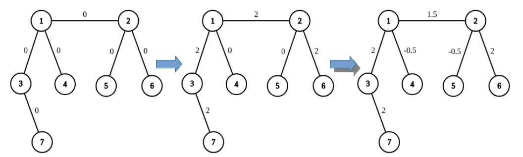 Для примера на изображении ниже показан результат применения двух операций к графу: прибавления \(2\) на пути от \(7\) до \(6\), а потом прибавления \(-0.5\) на пути от \(4\) до \(5\).