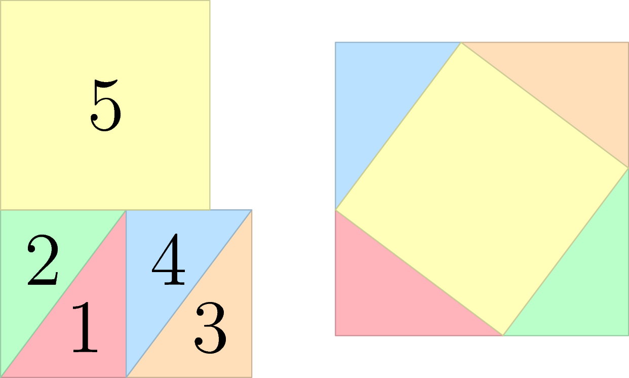 Затем мы берем прямоугольник, который у нас все еще лежит с первого шага, и четыре меньших прямоугольника, и собираем из них желаемый квадрат три на три.