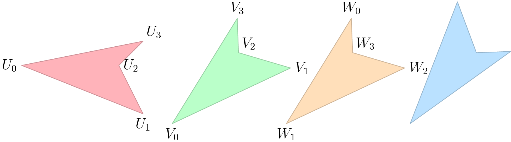 На рисунке слева: фигуры \(U\) и \(V\) эквивалентны. Фигура \(W\) не эквивалентна им, потому что точки \(W\) следуют в другом порядке. Четвертая фигура не эквивалентна остальным независимо от порядка точек, потому что отражение не допускается.