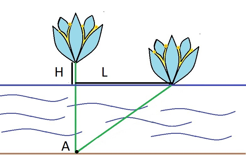 Инесса плавала по озеру в лодке и заметила прекрасный цветок водяной лилии над поверхностью воды. Она подплыла к цветку поближе и оказалось, что цветок находится на высоте \(H\) над уровнем воды. Инесса взяла цветок и отплыла на расстояние \(L\). В этот момент цветок коснулся воды.