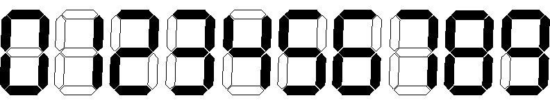 Цифры такого вида вы наверняка видели на электронных часах: для отображения цифры используются семь сегментов, каждый из которых может быть подсвечен или нет; подсвеченные сегменты образуют цифру. Представив, что цифры записаны именно так, Вася берет правую половину билета и накладывает ее на левую, совмещая первую цифру с n + 1-й, вторую с n + 2-й, ..., n-ю с 2n-й. Для каждой пары совмещенных цифр он подсчитывает, сколько сегментов подсвечены как в одной цифре, так и в другой, и суммирует эти количества. Полученную величину он называет счастливостью билета. Например, счастливость билета 03 равна четырем, а счастливость билета 2345 — шести.