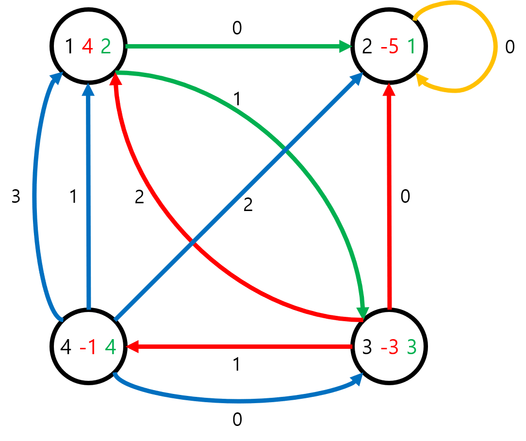 Три числа, показанные на вершине \(i\), равны соответственно \(i\), \(k_i\) и \(m_i\). Числа на ребрах показывают их номер в списке выходящих ребер из \(i\)-й вершины.