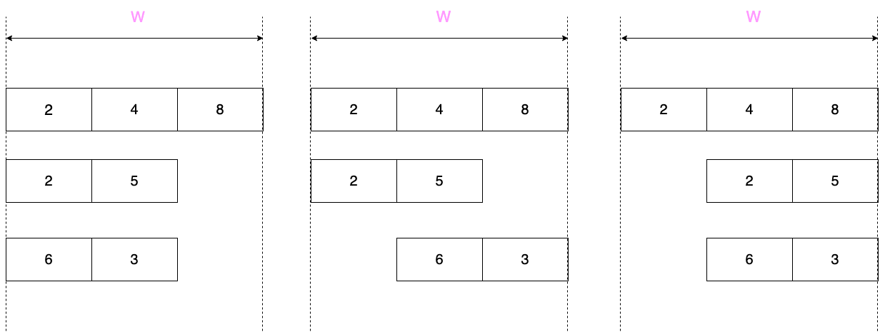 Вам дано \(n\) массивов, которые могут иметь разные длины. Также вам дана таблица с \(w\) столбцами и \(n\) строками. \(i\)-й массив горизонтально расположен в \(i\)-й строке. Вы можете двигать каждый массив внутри его строки, но он должен всегда занимать подряд идущие клетки и лежать полностью внутри таблицы.