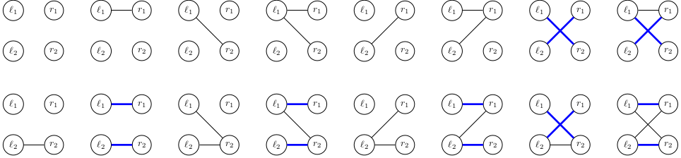 В первом примере, каждый из \(16\) графов равновероятен. Из них у \(7\) есть совершенное паросочетание: