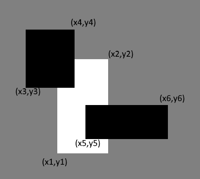 Пример расположения трёх прямоугольников. Определите, осталось видно хотя бы часть белого листа, если смотреть на стол сверху, после того, как на стол положили два черных листа. Часть белого листа видно в том случае, если существует хотя бы одна точка, лежащая нестрого внутри белого листа и лежащая строго вне обоих черных листов.