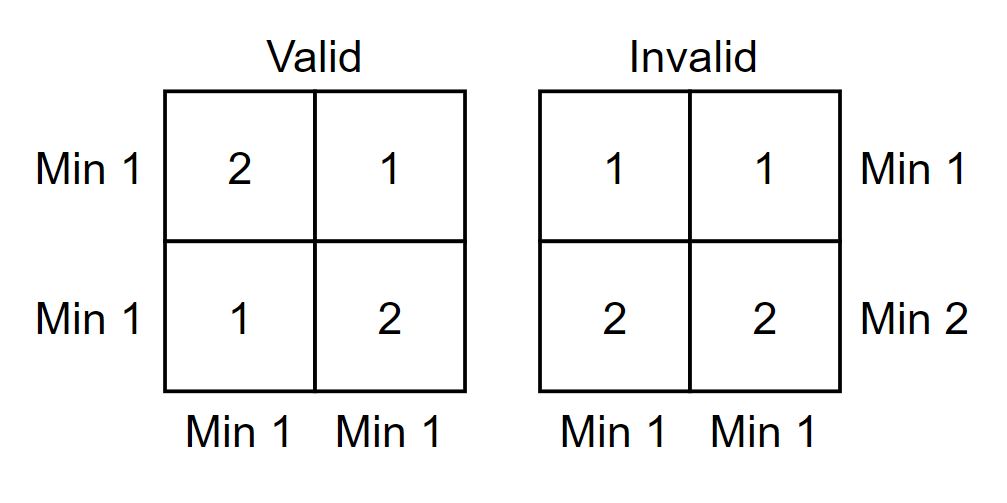 Пример правильной (слева) и неправильной (справа) таблицы, где \(n=k=2\). Выходные данные