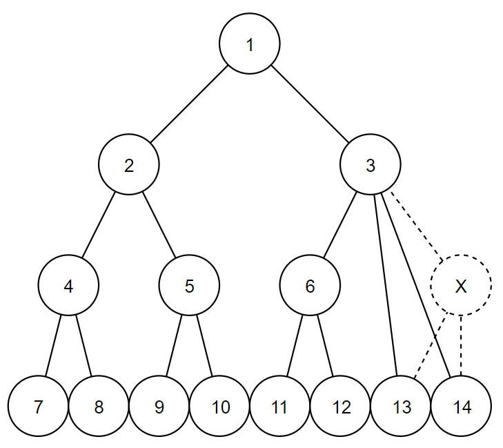- Создадим полное бинарное дерево с \(2^{n} - 1\) вершинами. То есть дерево, где ровно одна вершина является корнем, все листы имеют одинаковую высоту (расстояние до корня) и все не листовые вершины имеют по два прямых потомка.