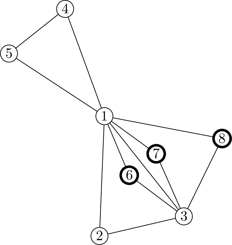 На картинке ниже изображен третий вариант графа из примера. Жирным отмечены вершины, которые может украсть Жулик.