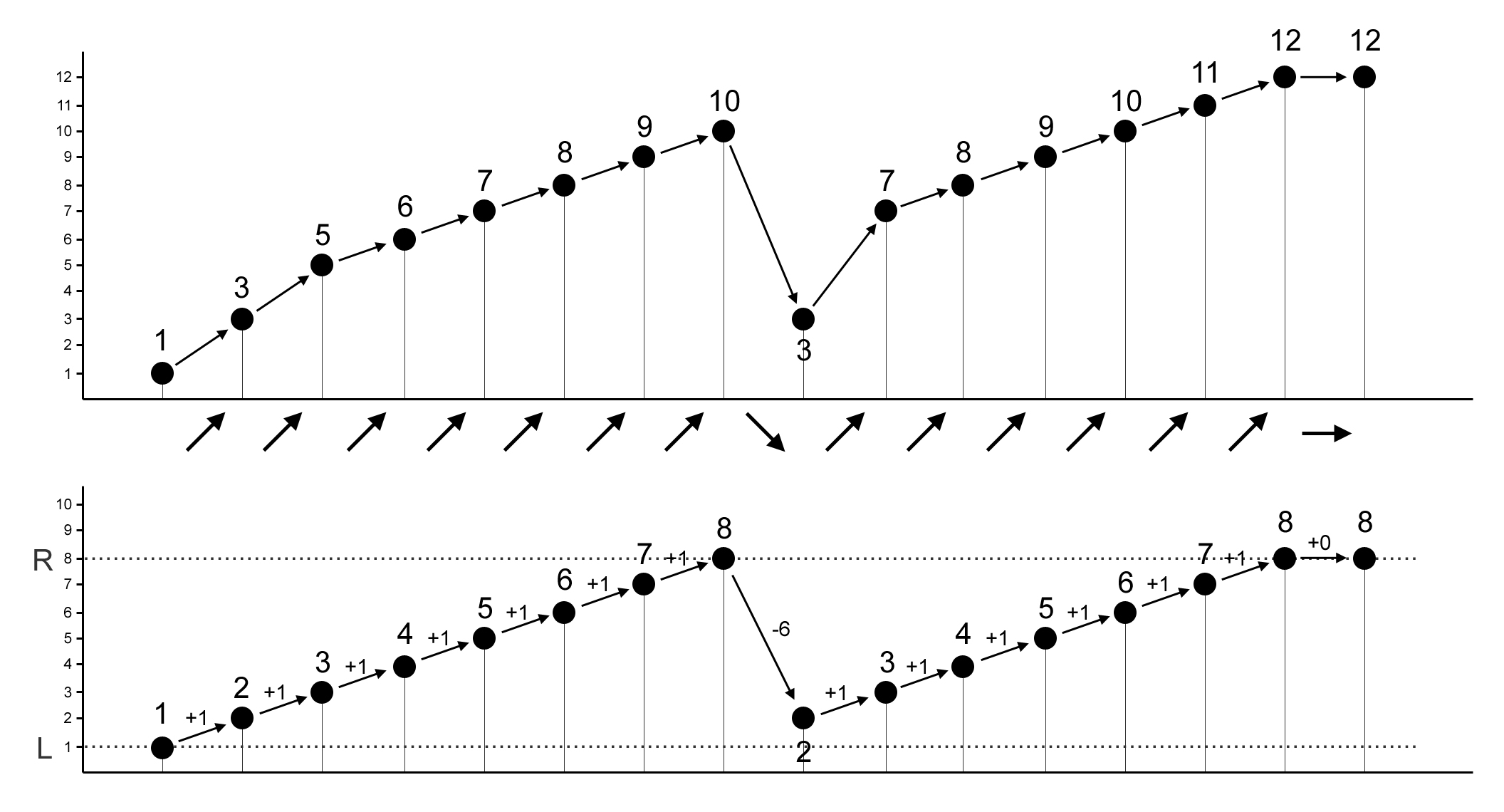 For example, consider a melody \(A = \{1,3,5,6,7,8,9,10,3,7,8,9,10,11,12,12\}\) as shown in the following figure. The diagonal arrow up in the figure implies that \(A_i < A_{i+1}\), the straight right arrow implies that \(A_i = A_{i+1}\), and the diagonal arrow down implies that \(A_i > A_{i+1}\).