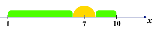 Поликарп идёт из \(1\) в \(10\). Желтая область показывает зону покрытия вышки радиуса покрытия \(1\), которая расположена в точке \(7\). Зеленая область показывает ту часть пути, когда Поликарп находится вне зоны покрытия.