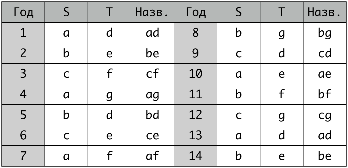 Например, если \(n = 3, m = 4, s = \){«a», «b», «c»}, \(t =\) {«d», «e», «f», «g»}, то строки для лет с 1 по 14 - {«ad», «be», «cf», «ag», «bd», «ce», «af», «bg», «cd», «ae», «bf», «cg», «ad», «be»}. Обратите внимание, что название года может повторяться.