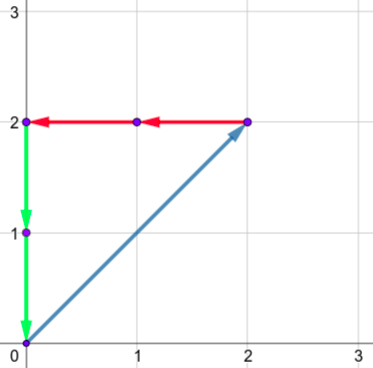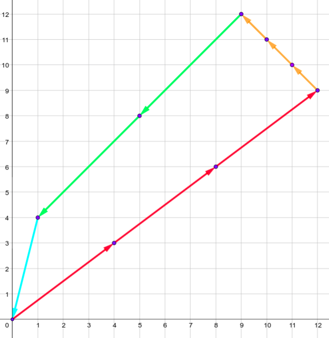 - Выберите один из векторов и отложите отрезок из текущей точки, равный этому вектору. То есть, если ваша текущая точка имеет координаты \((x, y)\) и вы выбираете вектор \((u, v)\), нарисуйте отрезок из текущей точки в точку с координатами \((x + u, y + v)\) и встаньте в точку \((x + u, y + v)\).