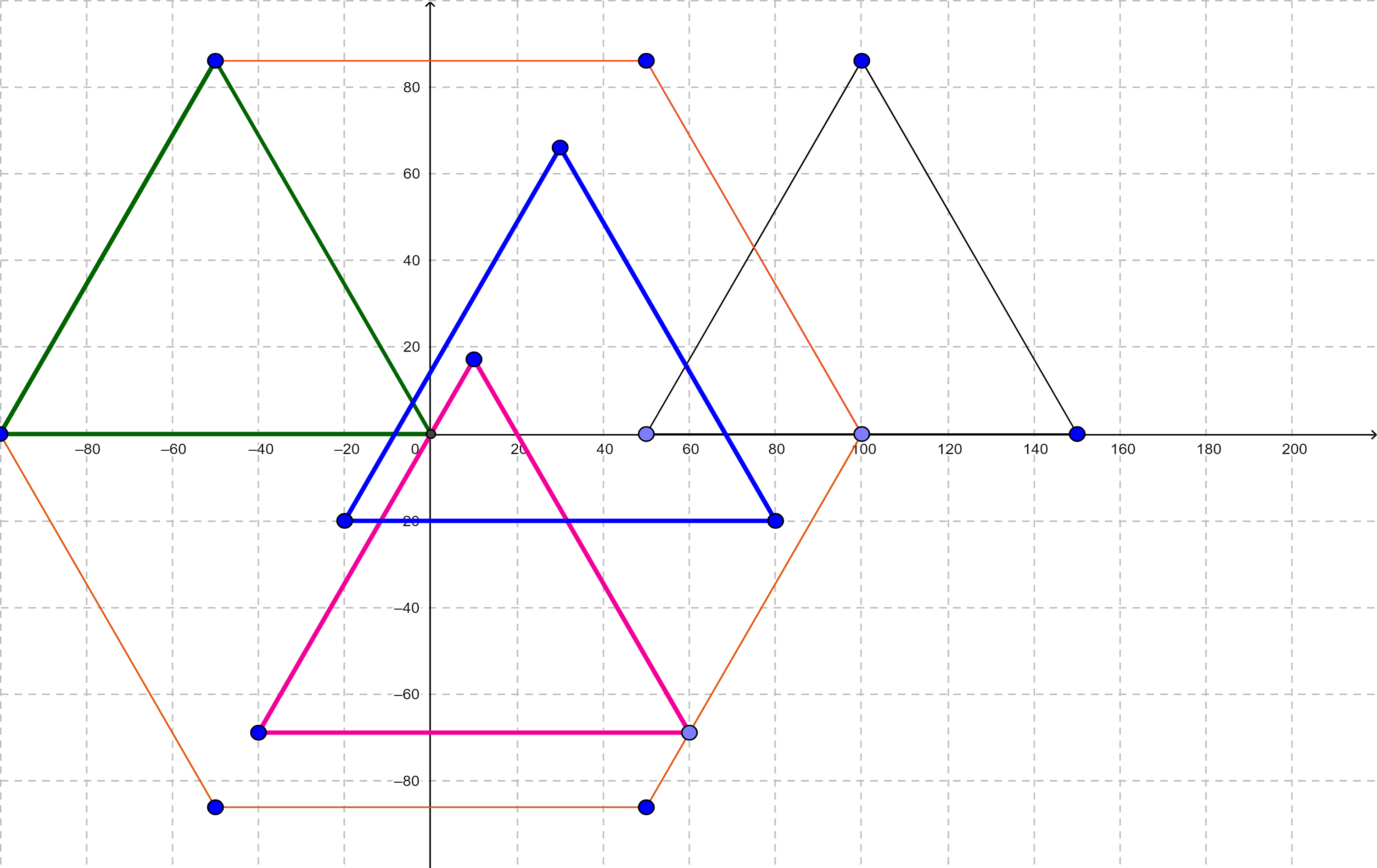 Обозначим как \(T\) множество точек, являющееся объединением всех \(P(x,y)\) таких, что начало координат \((0,0)\) лежит в \(P(x,y)\) (в том числе и на границе). Также можно дать эквивалентное определение: точка \((x,y)\) принадлежит \(T\), только если в \(P\) существуют две точки \(A,B\) такие, что \(\overrightarrow {AB} = \overrightarrow {(x,y)}\). Можно показать, что \(T\) тоже является многоугольником. Например, если \(P\) — правильный треугольник, то \(T\) — правильный шестиугольник; на рисунке \(P\) нарисован чёрным цветом, а некоторые \(P(x,y)\), в которых лежит начало координат, нарисованы цветным: