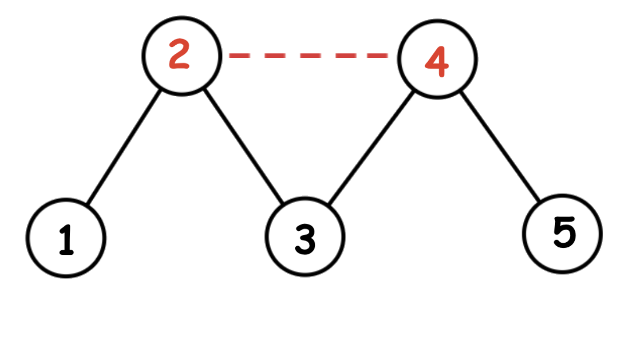 Граф из второго примера изображен ниже. Фермер Джон должен построить дорогу между полями \(2\) и \(4\), тогда кратчайший путь из \(1\) в \(5\) будет равен \(3\).